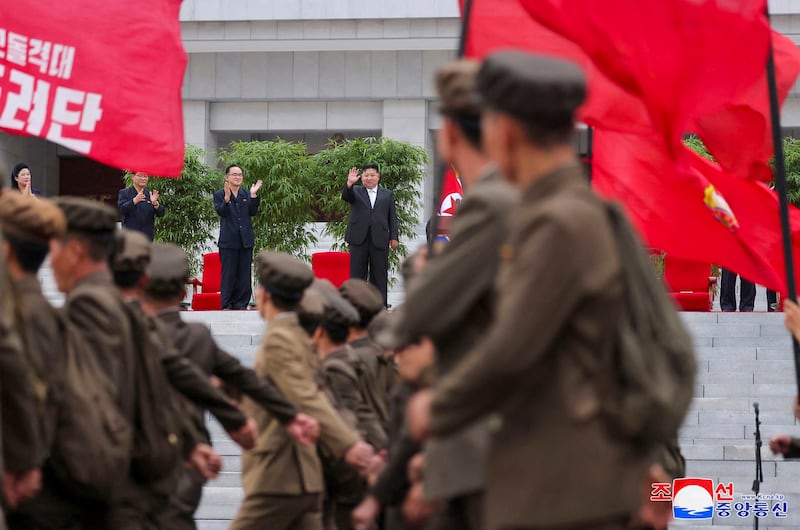 The troops are part of a new unit called the Paektusan Hero Youth Shock Brigade tasked with rebuilding efforts after heavy rains late last month caused flooding near the mouth of the Yalu River, which separates North Korea from China,