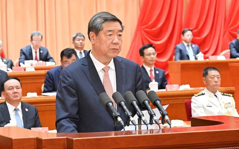 Chinese Vice Premier He Lifeng delivers a speech at a meeting celebrating the 70th anniversary of Xinjiang Production and Construction Corps in Urumqi, in China’s Xinjiang region on Oct. 7, 2024. (Li Xiang/Xinhua via Getty Images)