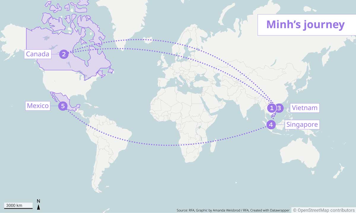 Minh initially arrived on a tourist visa to Canada in early 2023. After the immigration authorities refused him entry, he returned to Vietnam where he waited several months before a smuggler arranged for him to fly to Singapore and Mexico.